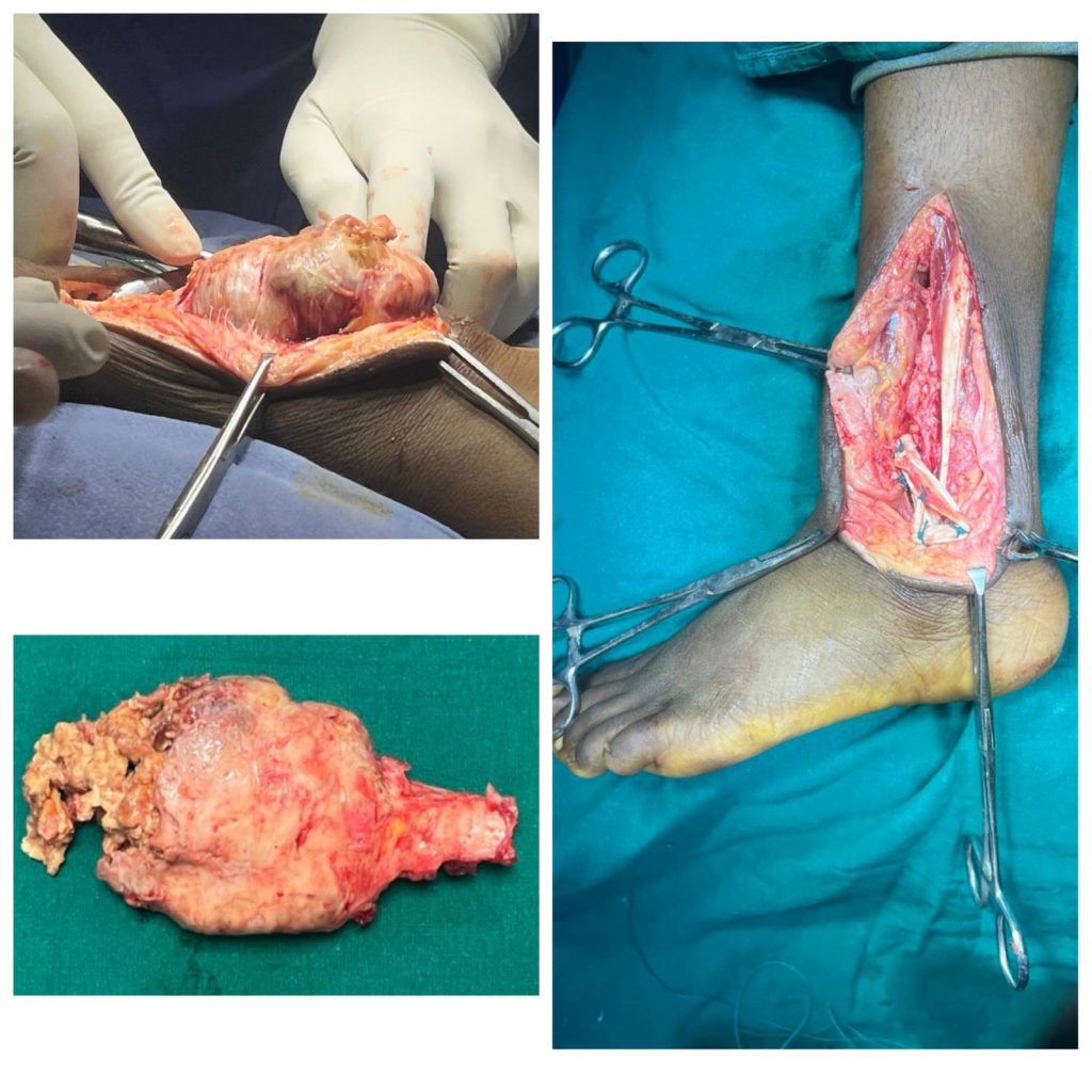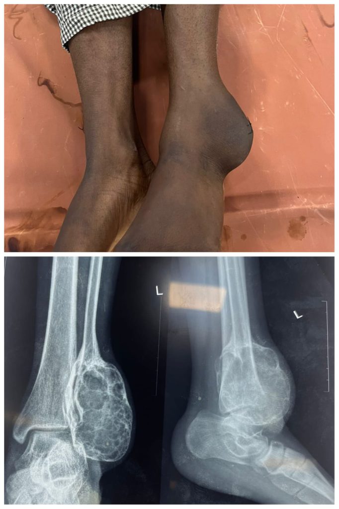 She had a swelling left ankle for two years with sudden increase in size three months duration.Complete diagnostic workup including MRI ankle and biopsy was done here ,diagnosed as Locally Aggressive Giant Cell Tumor Distal Fibula left side .